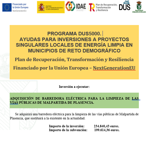 - Adquisición de barredora eléctrica para la limpieza de vías públicas de Malpartida de Plasencia.