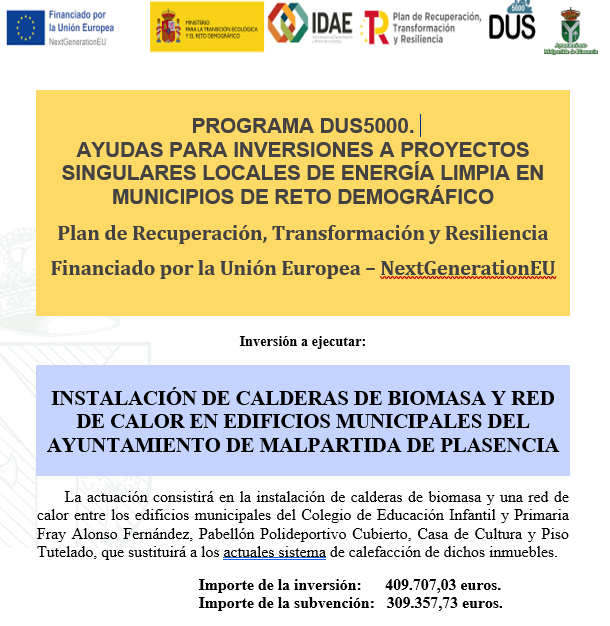 - Instalación de caldera de biomasa y red de calor en edificios municipales de Ayuntamiento de Malpartida de Plasencia.