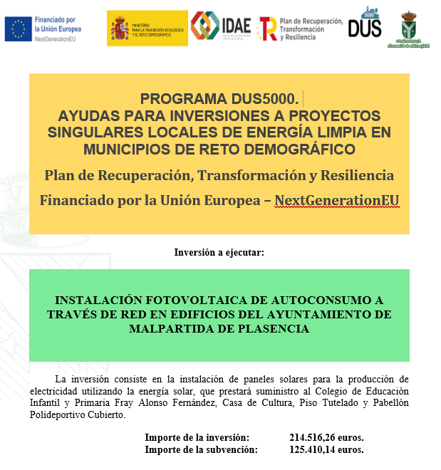 - Instalación fotovoltaica de autoconsumo a través de red en edificios del Ayuntamiento de Malpartida de Plasencia.