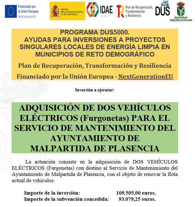 - Adquisición de dos vehículos eléctricos para el servicio de mantenimiento del Ayuntamiento de Malpartida de Plasencia.