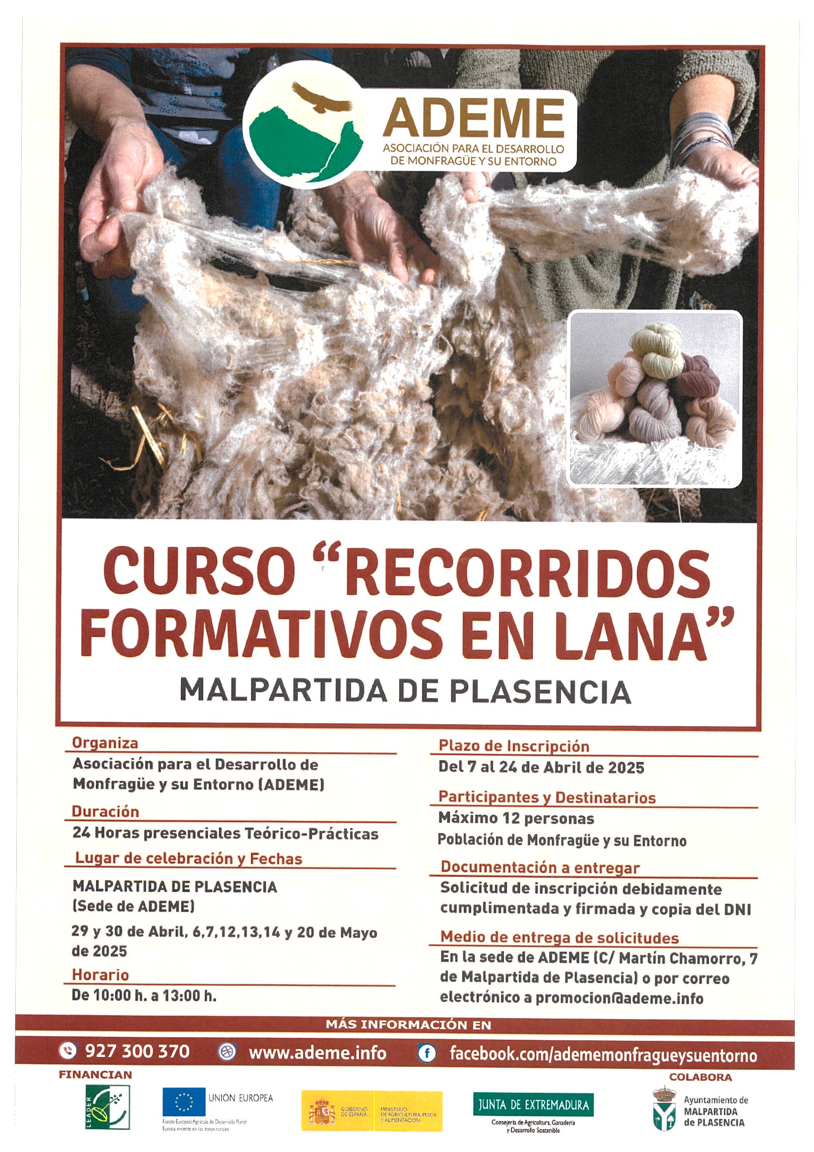 Desde ADEME hemos organizado una nueva edición del CURSO "RECORRIDOS FORMATIVOS EN LANA", que se celebrará en la sede de ADEME (C/ Martín Chamorro, 7) de la localidad de Malpartida de Plasencia los días 29 y 30 de abril, 6, 7, 12, 13, 14 y 20 de mayo 2025, en horario de 10:00 a 13:00 horas, con una duración de 24 horas presenciales teórico-prácticas.