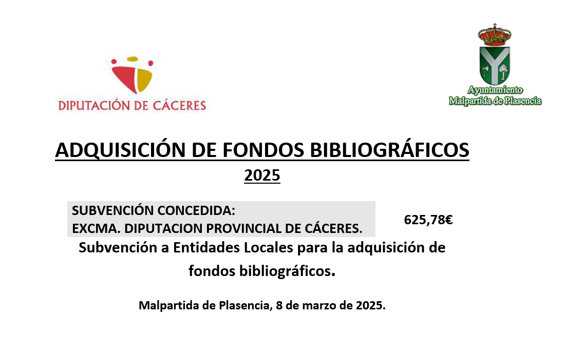 SUBVENCIÓN CONCEDIDA POR LA DIPUTACIÓN PROVINCIAL DE CÁCERES PARA LA ADQUISICIÓN DE FONDOS BIBLIOGRÁFICOS 2025 13 agosto 2025 SUBVENCIÓN CONCEDIDA POR LA DIPUTACIÓN PROVINCIAL DE CÁCERES PARA LA ADQUISICIÓN DE FONDOS BIBLIOGRÁFICOS 2025