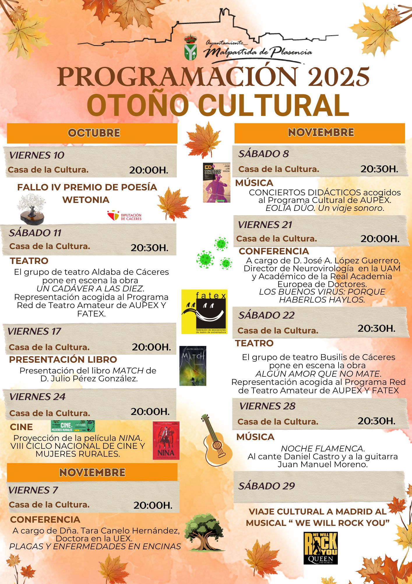 l Ayuntamiento de Malpartida de Plasencia, a través de su Concejalía de Cultura, invita a todos los vecinos y vecinas a participar en la Programación de Otoño Cultural 2025, que se celebrará en la Casa de la Cultura durante los meses de octubre y noviembre.