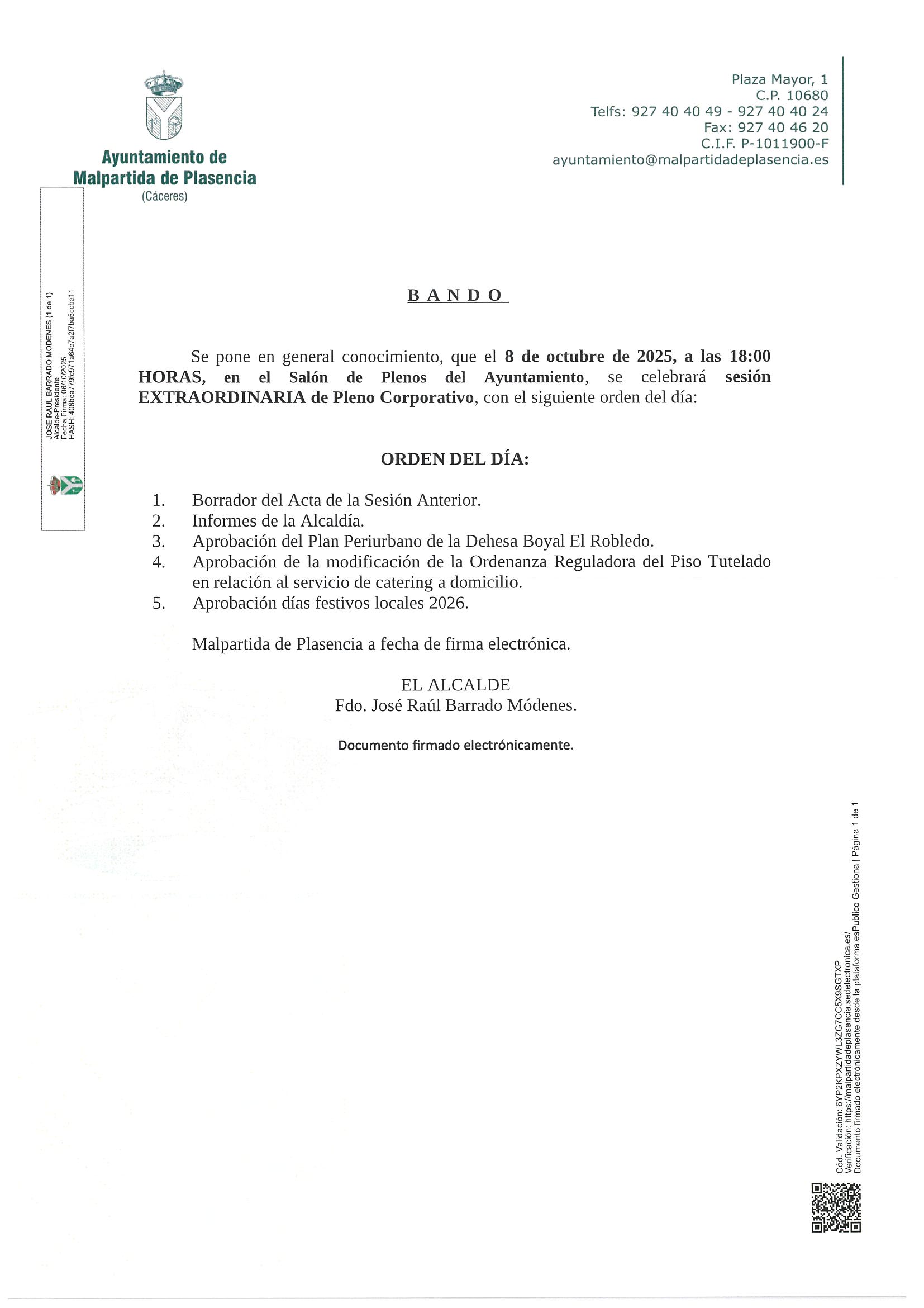 CELEBRACIÓN DE SESIÓN DE PLENO EXTRAORDINARIO DÍA 08 DE OCTUBRE