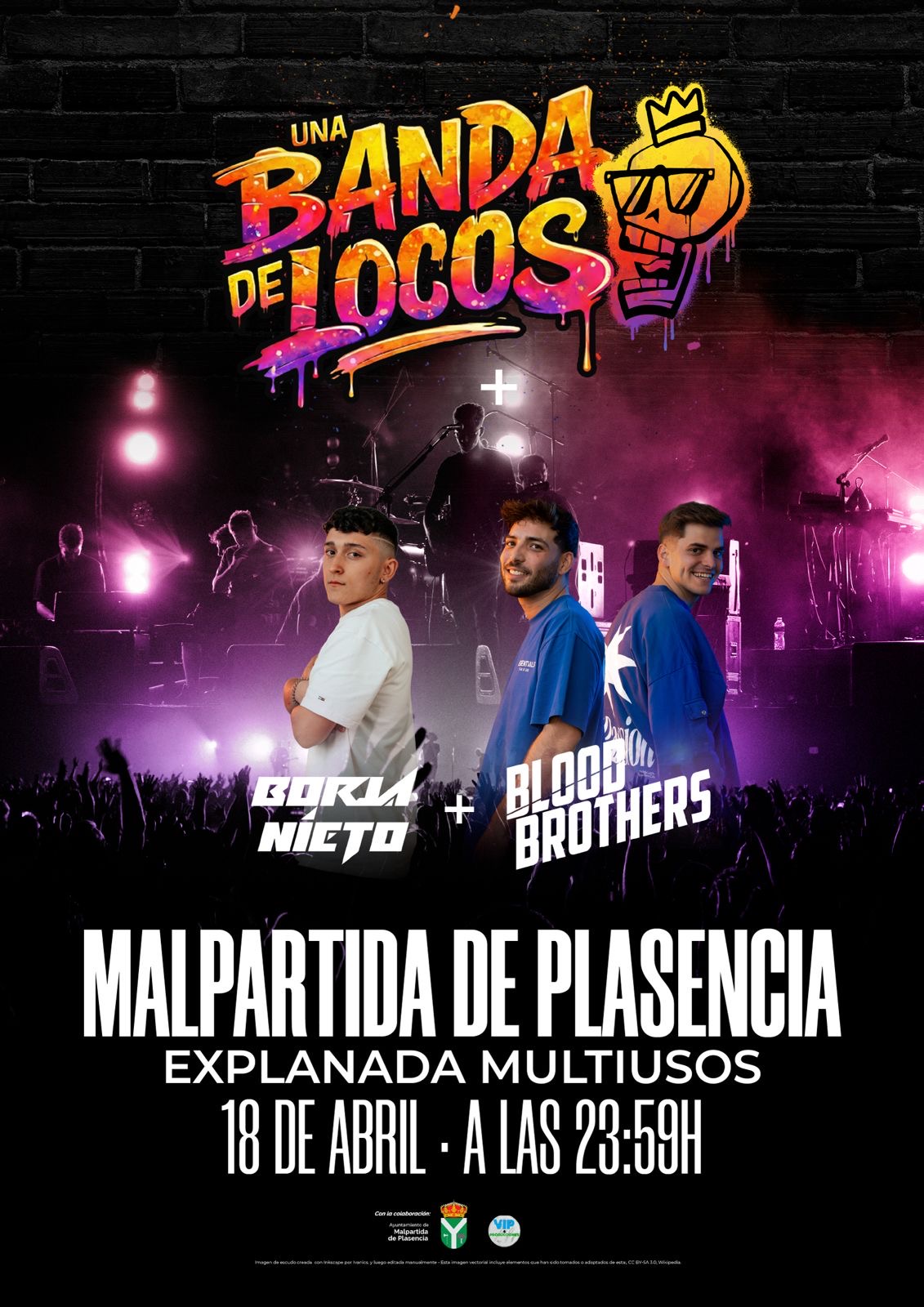 El próximo Sábado día 18 de Abril, tendrá lugar en la explanada multiusos, a partir de las 23:59h la actuación del grupo "UNA BANDA DE LOCOS" y a continuación comenzarán los DJ´s "BORJA NIETO Y LOS BLOOD BROTHERS"